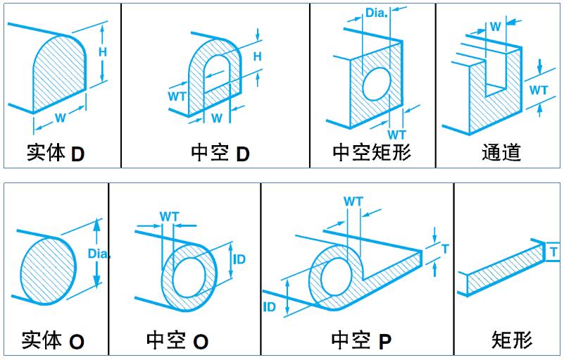 提供多種截面型狀定制:實(shí)體"O"型,中空"O"型,實(shí)體"D"型,中空"D"型,中空矩形,"P"型,矩形等